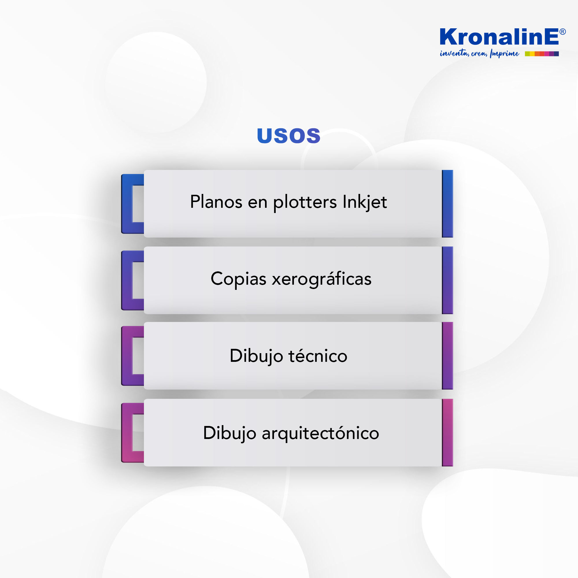 Papel base celulosa peso alto de muy alta transparencia y rigidez con una textura extra lisa, adecuado para impresión de líneas de alta resolución en impresiones monocromáticas y líneas de color con baja saturación en plotters con tintas Dye y Pigmentadas, para copiado Xerográfico e Impresión Láser, está preparado para trazo con grafito y tinta en dibujo manual con una excelente capacidad de borrado.