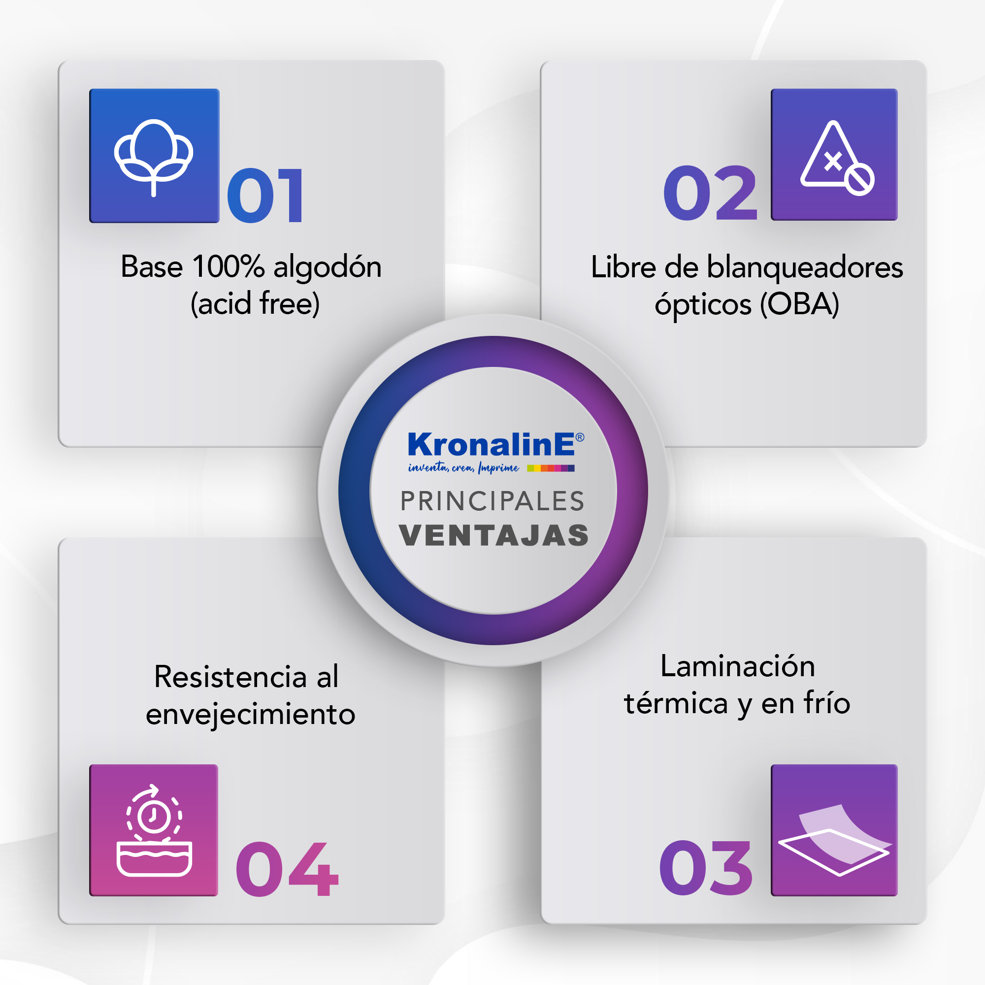 Papel artístico de peso y calibre medio con textura fuerte de la más alta calidad con base 100% de algodón libre de ácido y blanqueadores ópticos. Cuenta con un recubrimiento mate especial que garantiza una extendida duración al envejecimiento, que en combinación con tintas Vivera® 70 o 91 de HP® tiene una duración en uso normal en interiores de hasta 200 años y con tintas Epson® Ultrachrome® de mas de 100 años (certicación ISO y FOGRA). Es el papel preferido por excelencia de artistas y fotógrafos profesionales.
