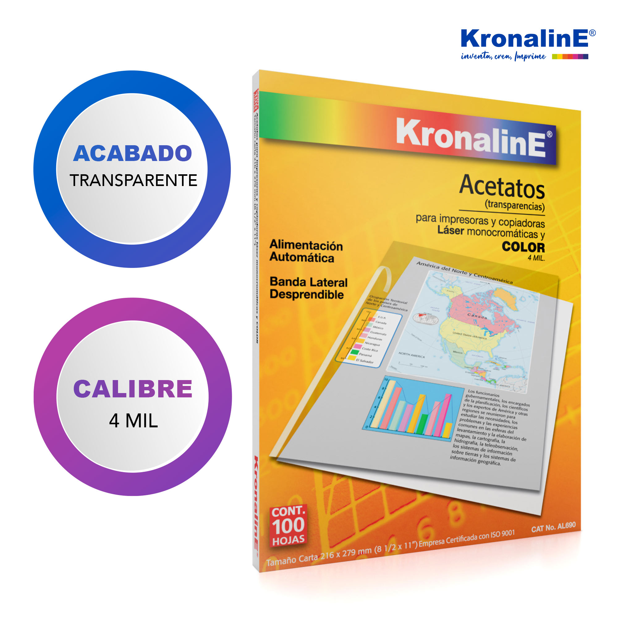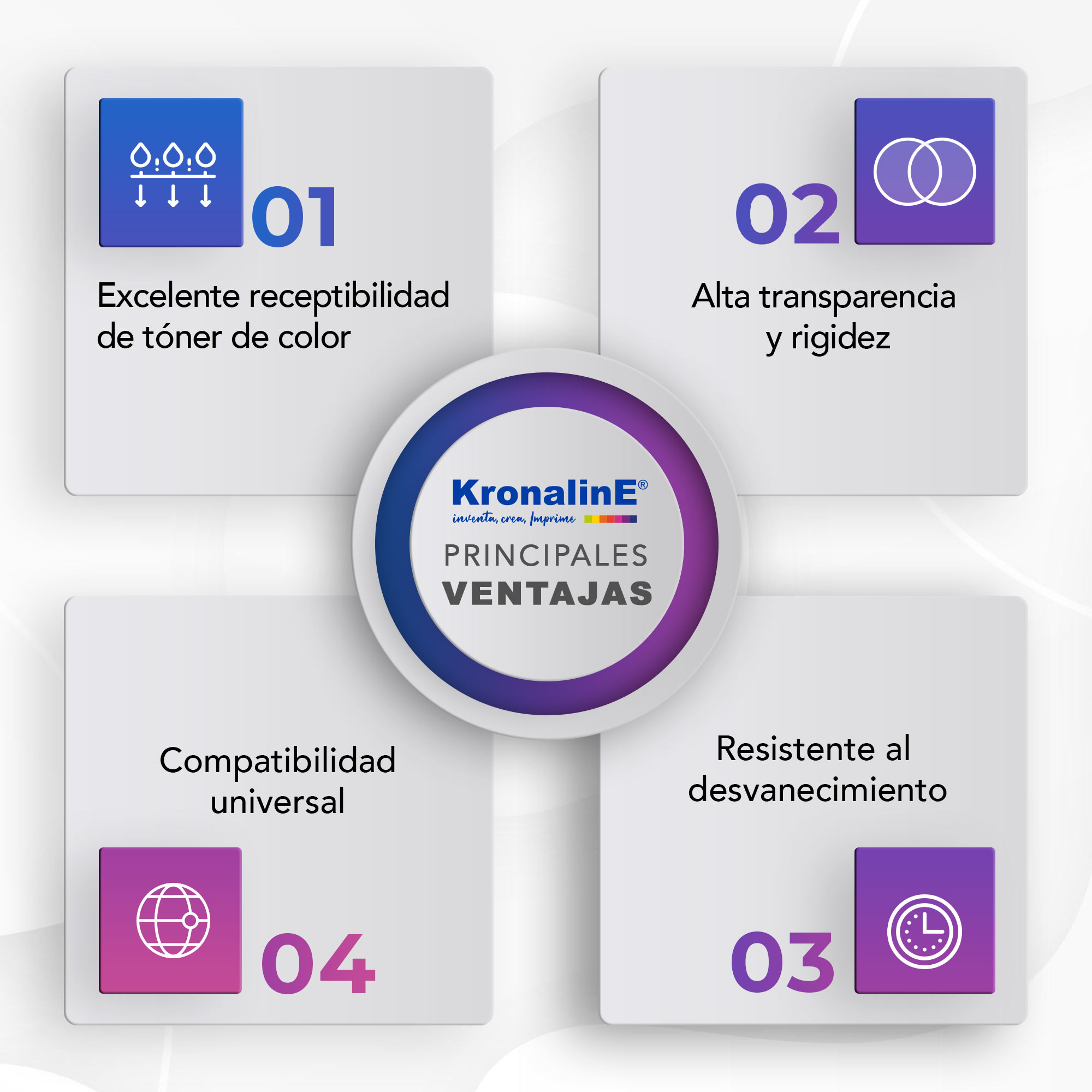 Película poliéster (PET) de alta transparencia con recubrimiento especial para todo tipo de impresoras y copiadoras Láser a color de escritorio, ideal para retroproyección o superposición de imágenes cuenta con banda lateral desprendible para facilitar la detección de la hoja con el lector óptico del equipo a utilizar.