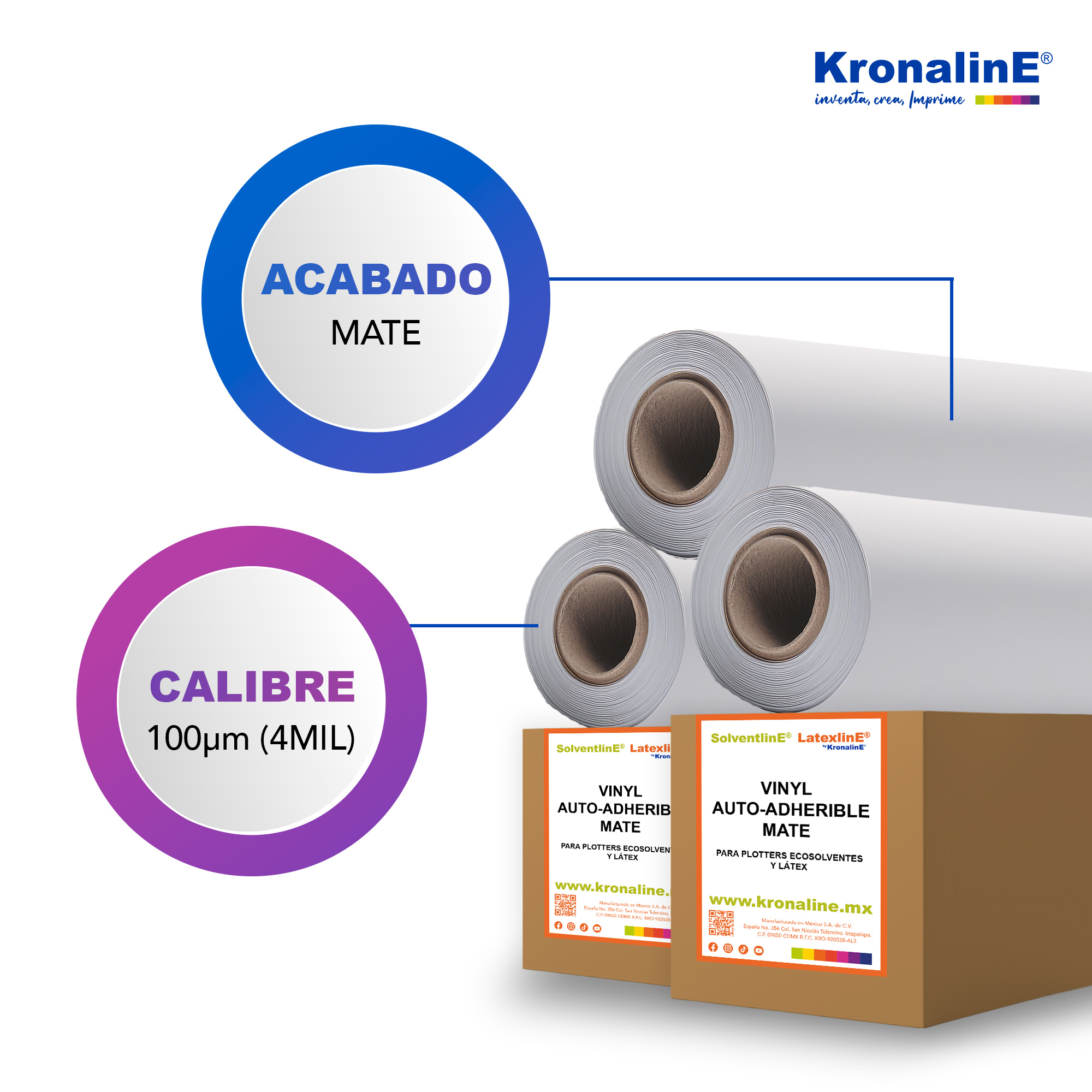 Vinilo calandrado con acabado mate diseñado especialmente para tintas ecosolventes y látex, que expuesto a manera vertical tiene una durabilidad de hasta 18 meses en climas normales, con un adhesivo permanente base acrílico.