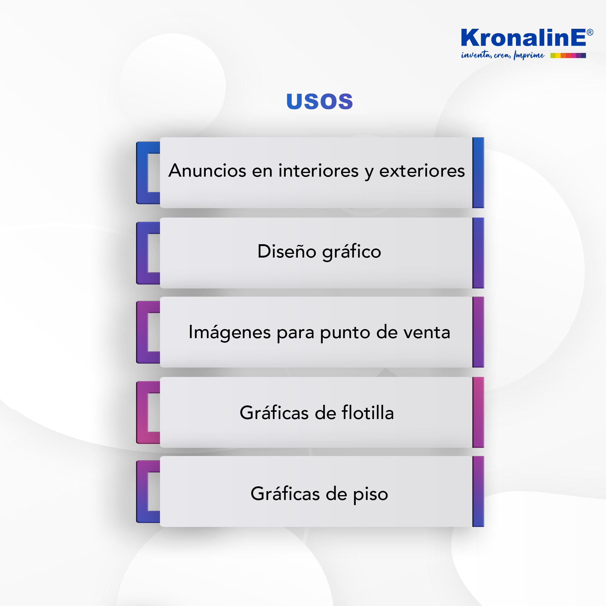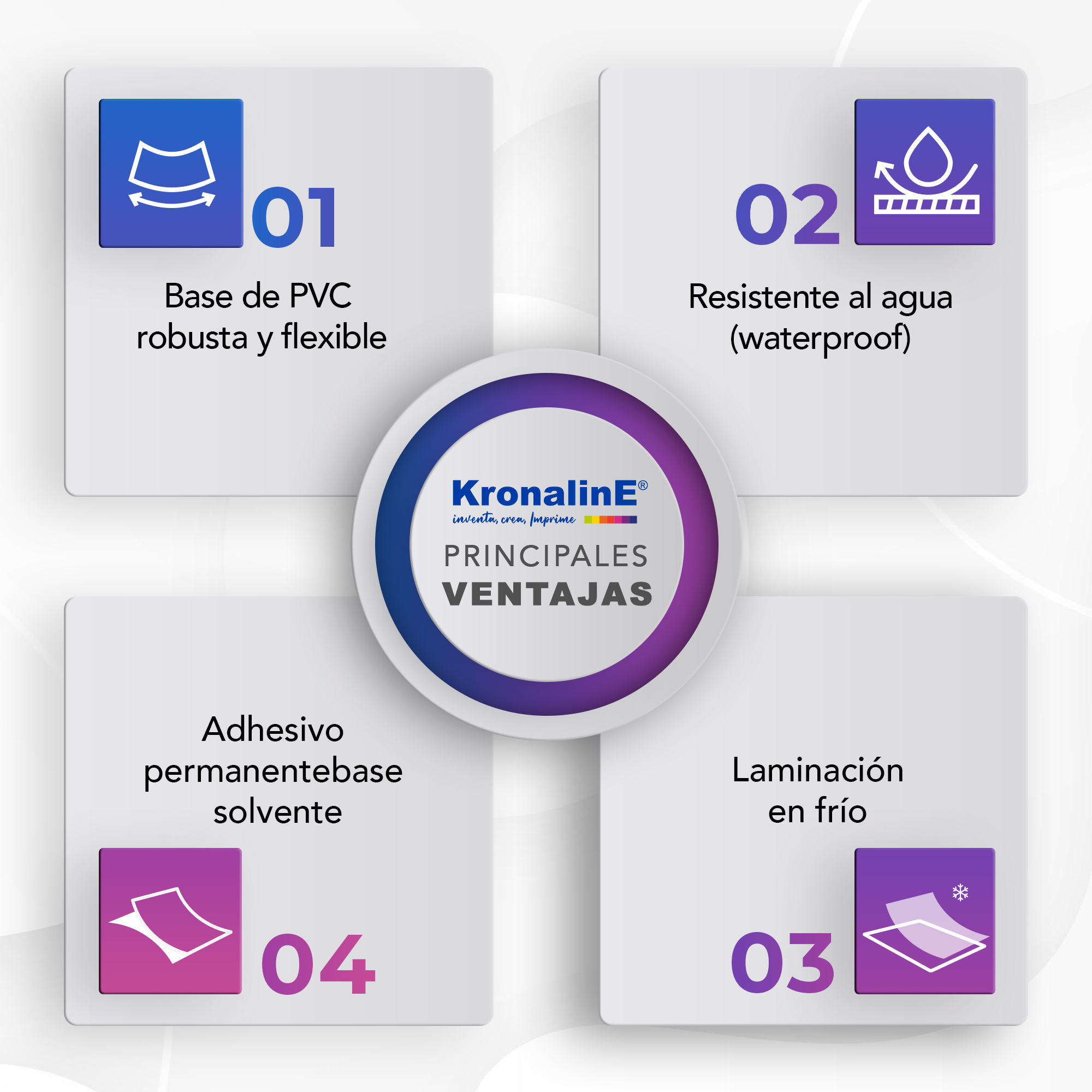 Este producto es catalogado como el mejor del mercado a nivel mundial debido a que cuenta con un recubrimiento mate resistente al agua, agregado a ello tiene un adhesivo permanente base solvente el cual asegura una larga duración una vez aplicado . Acepta altas cantidades de tinta y usando tintas Pigmentadas está garantizado cuando menos 3 meses en exteriores sin laminación y mínimo 12 meses si es laminado en frío.